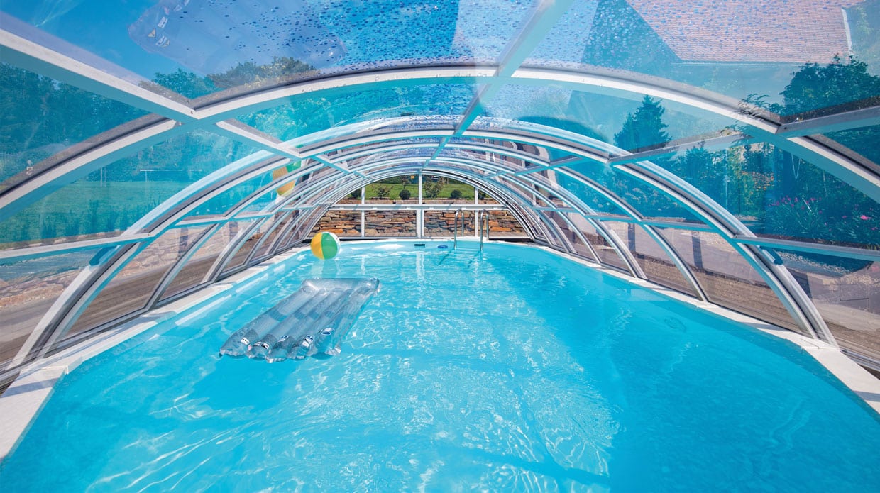 Cabriodom Elegant; eine Poolüberdachung  in extra flacher Bauweise