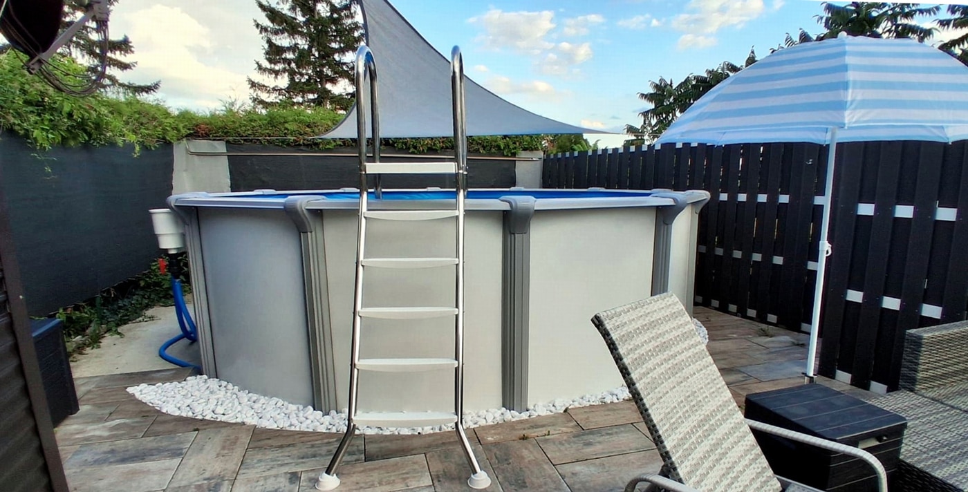 Rundes Schwimmbecken Modell Rimini, teilversenkt mit Pflasterung und Einstiegsleiter